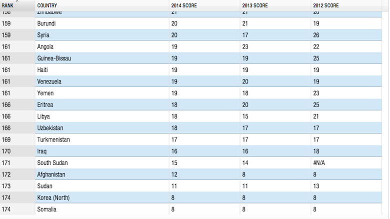 The big baddies are, arguably, the more interesting part of the list. Leading the list as the most corrupt countries are Somalia, North Korea, Sudan, South Sudan, and Afghanistan. No surprises there, really, if I’m being honest, but it’s still interesting to think about when its quantified like that.